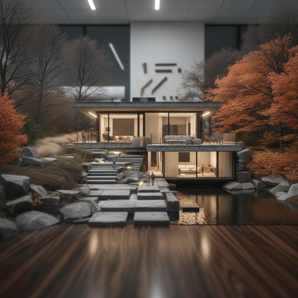 As a creative project "Lakeside" emerges as a scheme imbued with a profound philosophical and architectural ethos, drawing inspiration from the serene embrace of water and landscape. It transcends the boundaries of conventional dwelling, delving into the intricate dance between contemporary architecture and the natural world. This visionary endeavor envisions structures that seamlessly merge with rural landscapes, offering a harmonious coexistence with natural or man-made bodies of water, be it lakes, streams, or reservoirs.